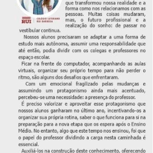 É preciso valorizar e aproveitar esse protagonismo que nossos alunos ganharam no último ano, incentivando-os a organizar sua própria rotina, saber o que funciona para si na preparação para a nova etapa que os espera após o Ensino Médio. No entanto, algo que este tempo nos ensinou, foi que o papel do professor dividindo a carga nesta caminhada é essencial.