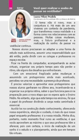 Auxiliá-los na construção deste conhecimento, oferecendo nossa experiência, atenção e cuidado, é mais do que nosso papel enquanto professores: é a nossa missão. Minha dica, portanto, neste momento final rumo ao vestibular, é que vocês aproveitem ao máximo o que seus professores têm a oferecer, pois com certeza, o início da realização de um sonho é o estudo e o planejamento, ainda que em tempos tão virtuais.