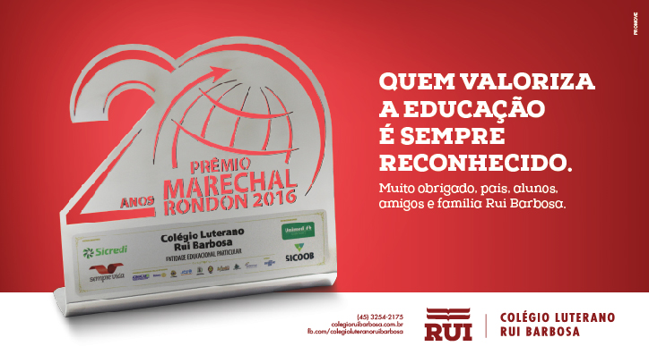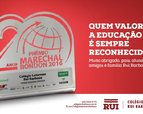 O Colégio Luterano Rui Barbosa, de Marechal Cândido Rondon, recebeu no dia 26 de novembro, pela vigésima vez, o Prêmio Marechal categoria Melhor Instituição de Ensino Particular. A premiação foi recebida pelo presidente da mantenedora, Ito Dari Rannov, pelo diretor, pastor Emerson Zielke e pela Coordenadora Pedagógica, Mônica Abboud Gerke.