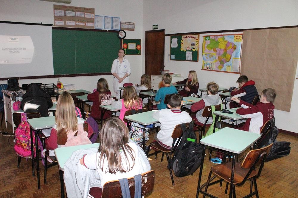 Com o objetivo de informar e esclarecer dúvidas os alunos dos 5º Anos, do Colégio Luterano Rui Barbosa, participaram de uma palestra educativa sobre o tema “Prevenindo doenças: o uso de vacinas” proferida pela enfermeira do Hospital Rondon, Vanessa Schuck.