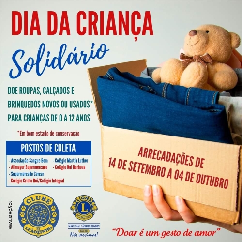 Com o objetivo de proporcionar um Dia das Crianças mais especial para crianças carentes do município, o Clube do Leãozinho do Lions Clube Marechal Cândido Rondon, realiza de 14 de setembro a 04 de outubro a campanha “Dia da Criança Solidário”.