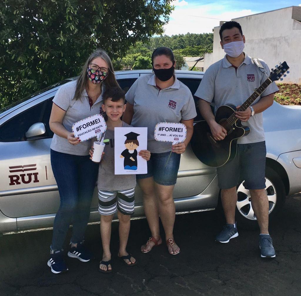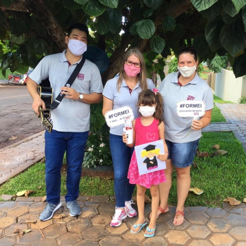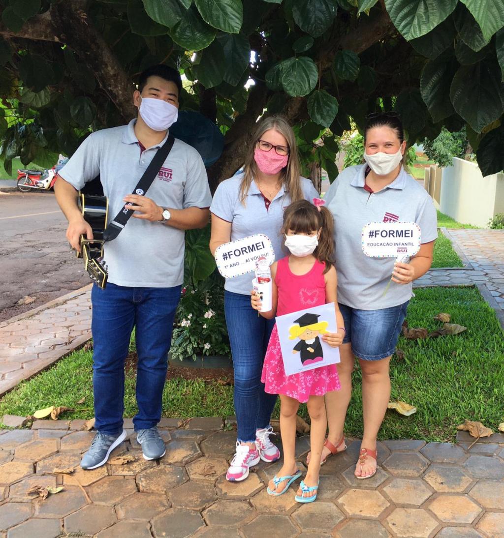 Os alunos do Infantil 5 foram surpreendidos com uma visita muito especial dos professores Renate Rohrer, Luis Ricardo Ebuchi e Mayara Honke. Por conta da pandemia, a solenidade presencial teve que ser suspensa, mas os professores encontraram uma forma significativa de marcar esta importante etapa: a conclusão da Educação Infantil.
