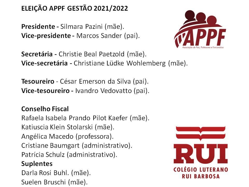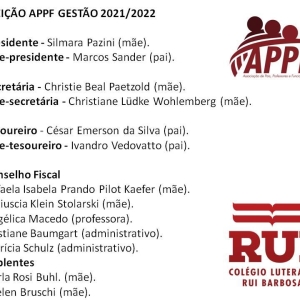 A comunidade escolar do Colégio Luterano Rui Barbosa elegeu nesta terça-feira (30) a nova diretoria da Associação de Pais, Professores e Funcionários Gestão 2021/2022. Por meio de eleição on-line, a votação contou com uma chapa inscrita, encabeçada pela presidente Silmara Pazini. A nova diretoria foi eleita por unanimidade.