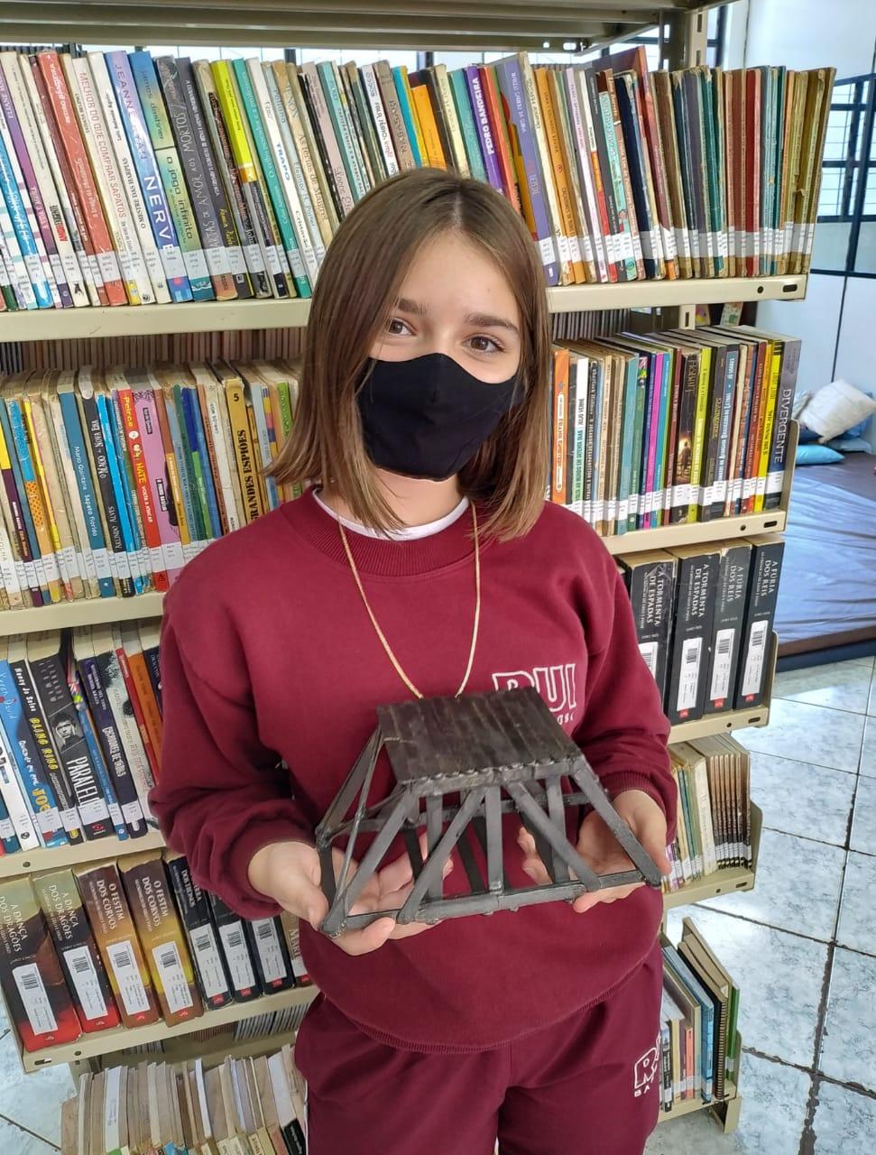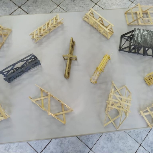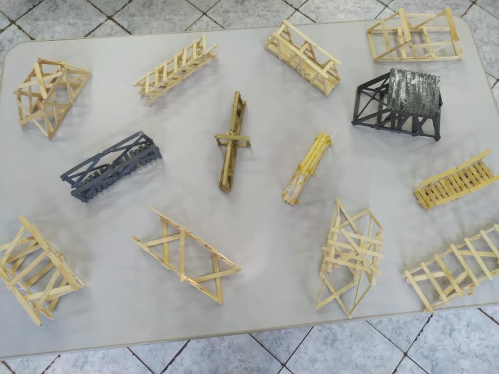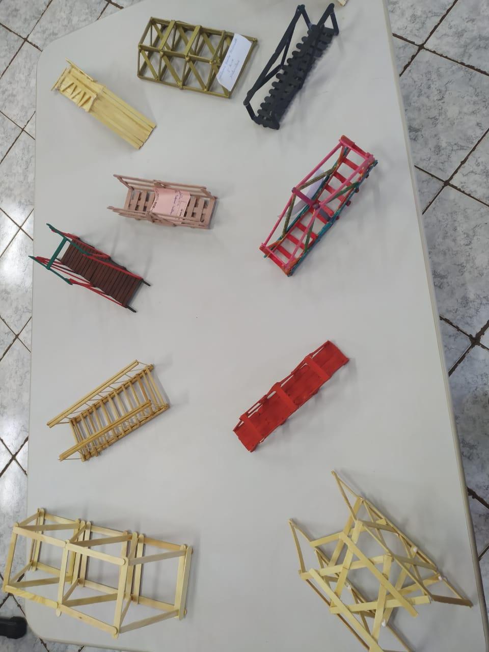Conforme o professor Jhonatan a atividade teve o objetivo de que os alunos pudessem refletir e entender a importância da gravidade, da distribuição de cargas e de estruturas entrelaçadas. “Foi um desafio e tanto, pois eles precisaram criar uma ponte para um vão de 20cm de comprimento, usando no máximo 30 palitos de picolé e cola quente”, explica.