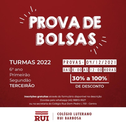 O Colégio Luterano Rui Barbosa lança nesta quinta-feira (11), o edital da Prova de Bolsas 2022. O concurso tem o objetivo de oferecer uma oportunidade para estudar no educandário, por meio de mérito acadêmico, para alunos do 6º Ano do Ensino Fundamental II e Ensino Médio (1ª a 3ª Série). As provas serão realizadas de modo presencial, no dia 04/12/2022, seguindo todas as recomendações sanitárias.