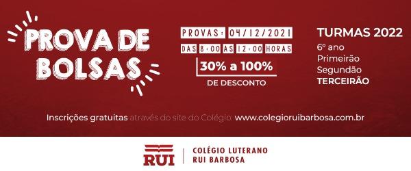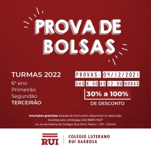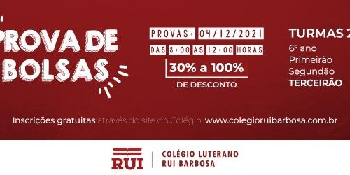 As inscrições para a Prova de Bolsas 2022 do Colégio Luterano Rui Barbosa encerram nesta sexta-feira (03.12). O concurso tem o objetivo de oferecer uma oportunidade para estudar no educandário, por meio de mérito acadêmico, para alunos do 6º Ano do Ensino Fundamental II e Ensino Médio (1ª a 3ª Série). As provas serão realizadas de modo presencial, no dia 04/12/2022, seguindo todas as recomendações sanitárias.