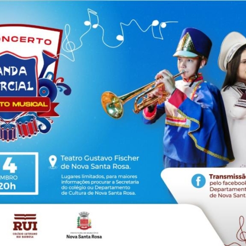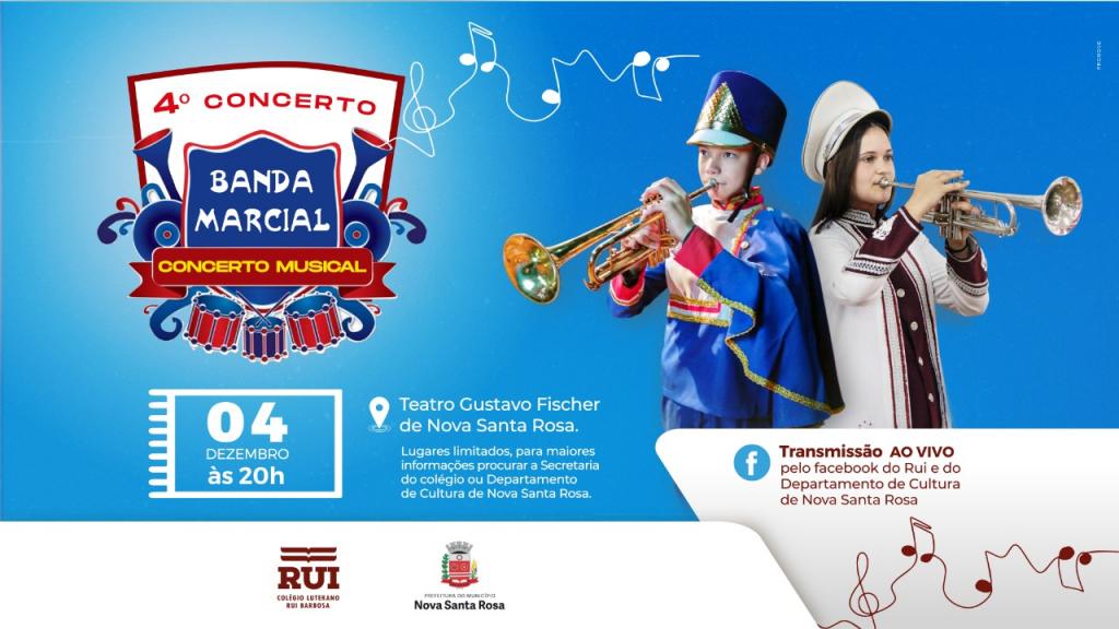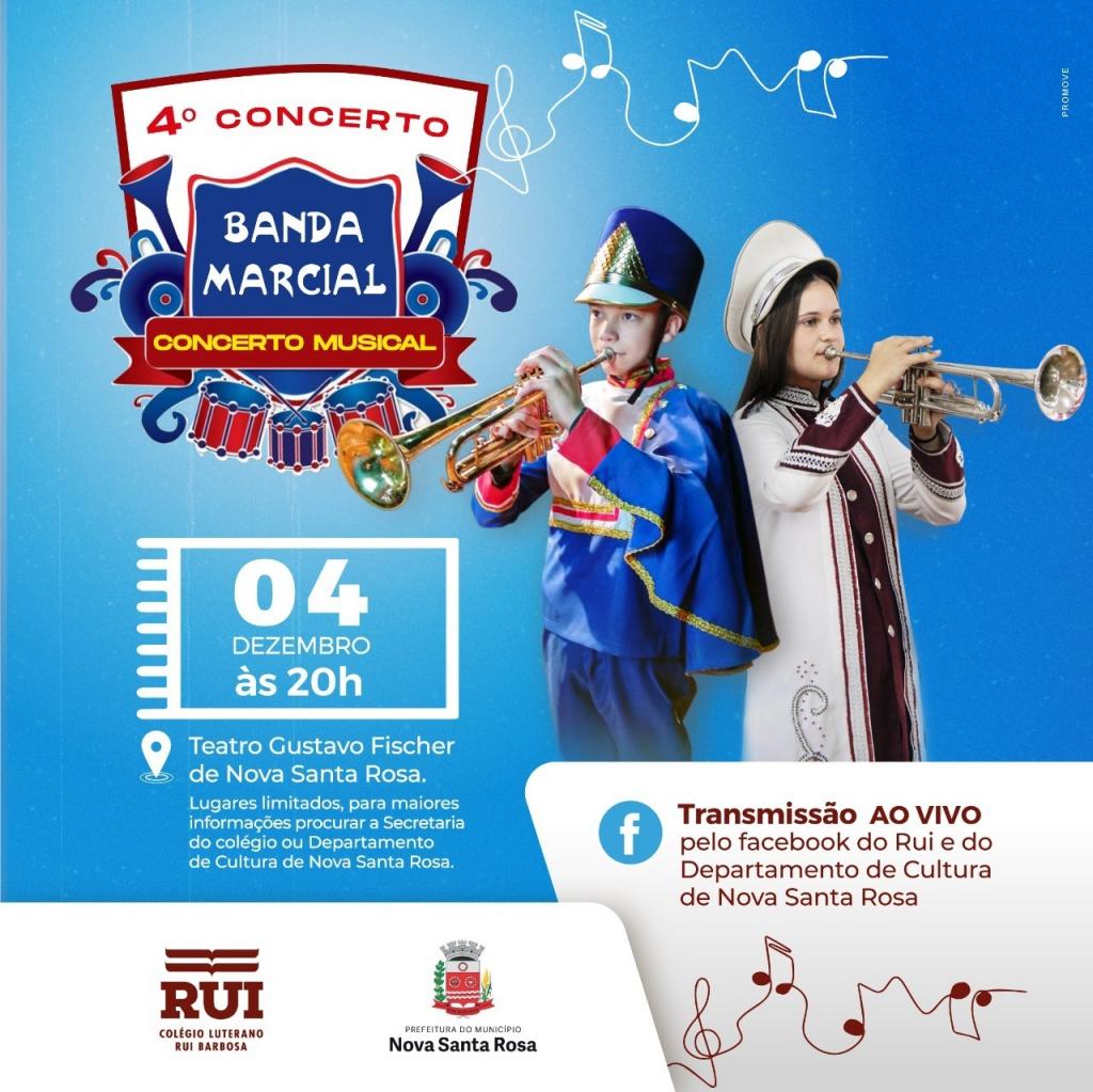 Neste sábado (4) acontece, a partir das 20h, o 4° Concerto Musical da Banda Marcial do Colégio Luterano Rui Barbosa, em parceria com a Banda Marcial de Nova Santa Rosa.