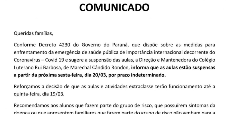 O Colégio Luterano Rui Barbosa informa que as aulas estão suspensas a partir da próxima sexta-feira, dia 20/03, por prazo indeterminado.