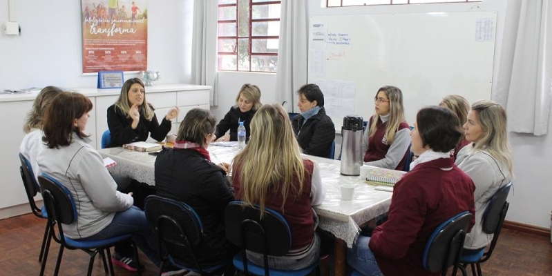 Professores participam de consultoria pedagógica com assessor do Programa A União Faz a Vida, do Sicredi. O objetivo foi verificar o andamento dos projetos.
