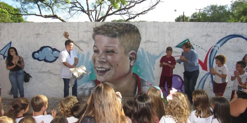 Alunos, professores e colaboradores do Rui Barbosa participaram na manhã desta sexta-feira (16), da apresentação da nova pintura em grafite do muro da escola.